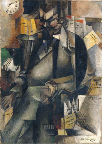 Albert Gleizes, qui a toujours fréquenté le milieu littéraire, convoque dans cette œuvre un certain nombre d’auteurs, poètes, critiques et peintres en inscrivant leurs noms ou le titre de leur ouvrage à même la toile, comme l’initièrent Georges Braque et Pablo Picasso. Ainsi Guillaume Apollinaire, auteur des Peintres cubistes, et le poète Paul Fort sont-ils cités aux côtés d’Alexandre Mercereau, critique et écrivain, Georges Polti occultiste passionné par l’ésotérisme des nombres, Gustave Kahn, critique au Mercure de France, et défenseur du cubisme, Jacques Nayal, directeur littéraire des éditions Figuière. Enfin Eugène Figuière lui-même, est représenté tenant son propre recueil poétique Les Murmures. La présence diffuse de jaune reprend la couleur des couvertures de l’éditeur et tranche avec le camaïeu gris-vert, propre au cubisme analytique.