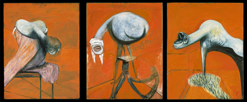 (Londres, Tate Gallery), fait scandale et marque un tournant décisif dans ses recherches. Assimilant les œuvres d’artistes du passé, comme Grünewald, Diego Vélasquez ou Rembrandt, mais aussi les photographies, comme celles d’Eadweard Muybridge, et les films dont ceux de Serguei Eisenstein et Luis Buñuel, Francis Bacon élabore des thèmes et des motifs qui deviendront récurrents dans son œuvre. Il en va ainsi des têtes hurlantes ou des corps en mouvement, qui témoignent d’une figure humaine que l’artiste soumet à de violentes déformations.