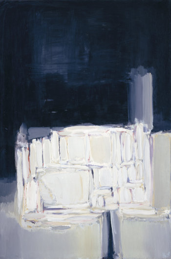Sur un fond bleu nuit, se détache une imposante cathédrale, aux couleurs claires et lumineuses. Le ciel sombre semble avoir été peint d’un seul geste, alors que le monument est composé de rectangles et de carrés exécutés en camaïeu de gris et blanc, séparés par quelques touches de rouge, de jaune ou de bleu qui semblent illuminer le bâtiment de l’intérieur. Le plus grand des rectangles reprend en réduction la masse de l’édifice.